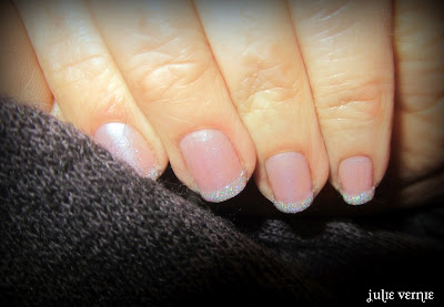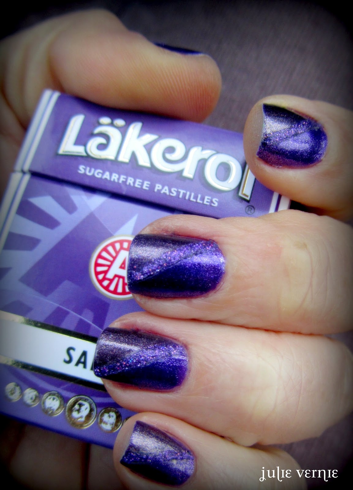 Pour voir les reflets se succéder comme dans la bouteille, il faut bouger les doigts. Les autres photos que j'ai prises à cet effet m'ont déçue. C'est en plaçant mes ongles à l'horizontale que je vois apparaître le bleu-vert foncé et, sur les photos, je n'ai pas aimé l'effet de perspective, alors j'ai laissé tomber.