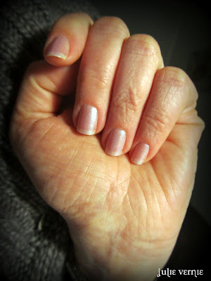 La veille du dernier jour, comme j'avais la flemme de faire une vraie manucure, j'ai concocté cette petite french à la va-vite. Le vernis pailleté holographique de Claire's (sans numéro) m'a été d'un grand secours même si j'ai dû mettre plusieurs couches. Résultat, c'est un peu épais, un peu rugueux malgré moult topcoat, mais le contraste des textures n'est pas désagréable.