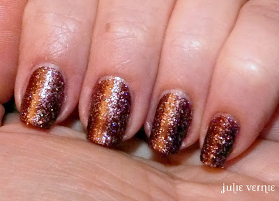 Sérieusement, des paillettes holo sur du marron, j'ai rarement vu ça. À part China Glaze Mahoganie. On dirait des truffes au chocolat roulées dans du sucre cristallisé ! Un vernis que j'avais pensé porter par temps froid, mais défi oblige.