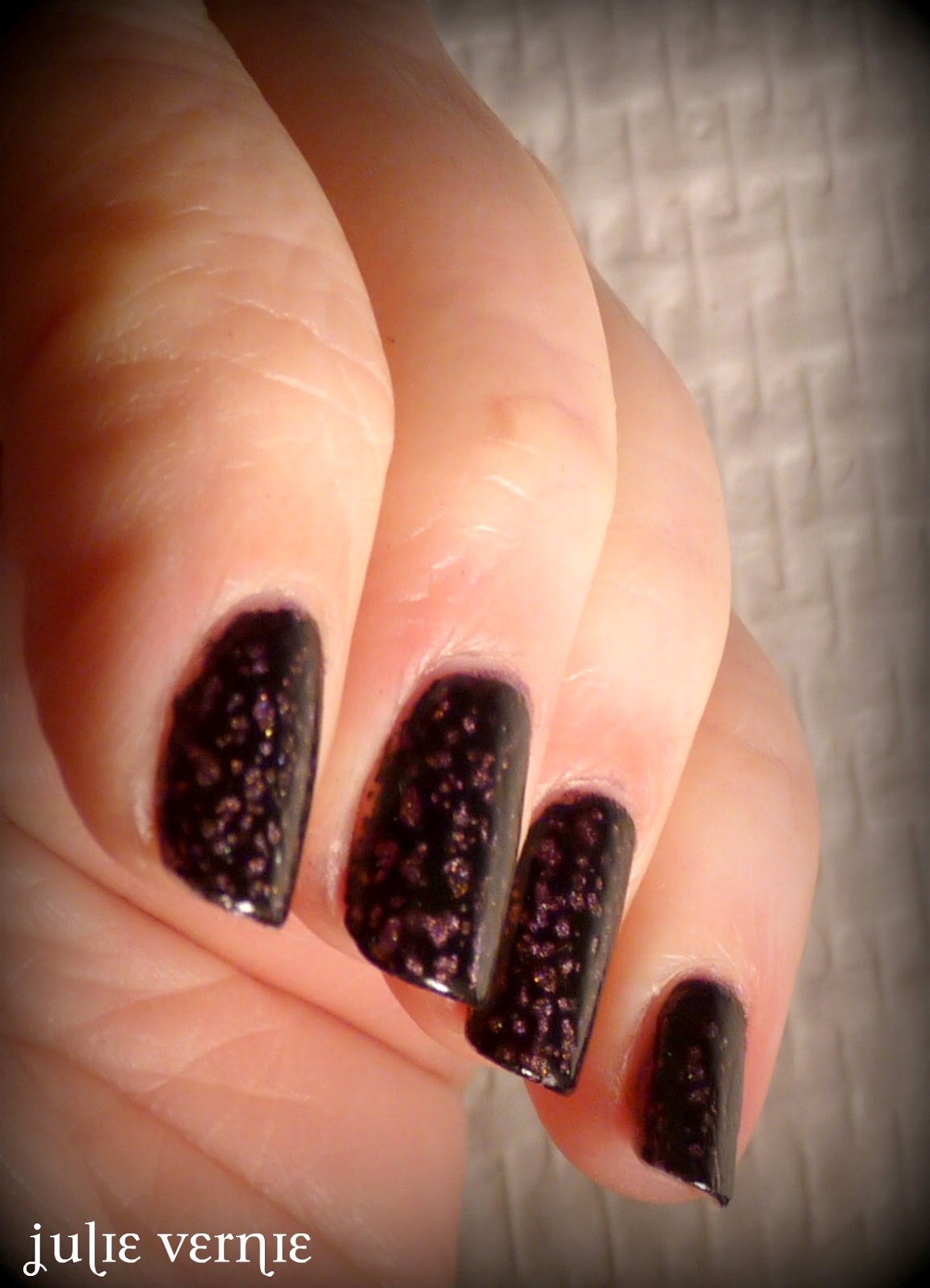 Ce qu'il y a en-dessous ? Un prune holographique Catherine Arley qui mérite un swatch séparé et dont j'ai prolongé l'existence de 24 heures avec Spotted. La meilleure façon d'appliquer Spotted est sur un vernis très sec : par conséquent, il peut parfaitement s'utiliser pour transformer une vieille manucure.