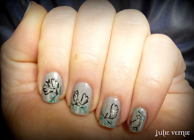 Le motif (celui de Sakura, je veux dire) est à la fois géométrique et figuratif, simple et délicat. Mais lorsque je vous dis que je n'arrive pas à l'ongle du petit orteil de son génie - avec tout le respect que je dois aux petits orteils et à leurs ongles - ce n'est pas un vain mot. De plus, la taille des ongles de Sakura est proportionnelle à son talent... non, car elle devrait les avoir encore plus longs ! La taille de mes ongles, elle, est proportionnelle à l'absence, chez moi, dudit talent. Surtout après ratiboisage général à 1 mm de bord libre ("je ne veux voir qu'une seule tête") suite à plusieurs vilaines casses. Du coup, le défi a consisté à reproduire le motif sur des ongles deux fois plus courts (et un peu plus larges, mais là n'est pas la question). Dans ce sens, la réalisation est très modeste ; quand à l'auriculaire, je le trouve brillamment raté.