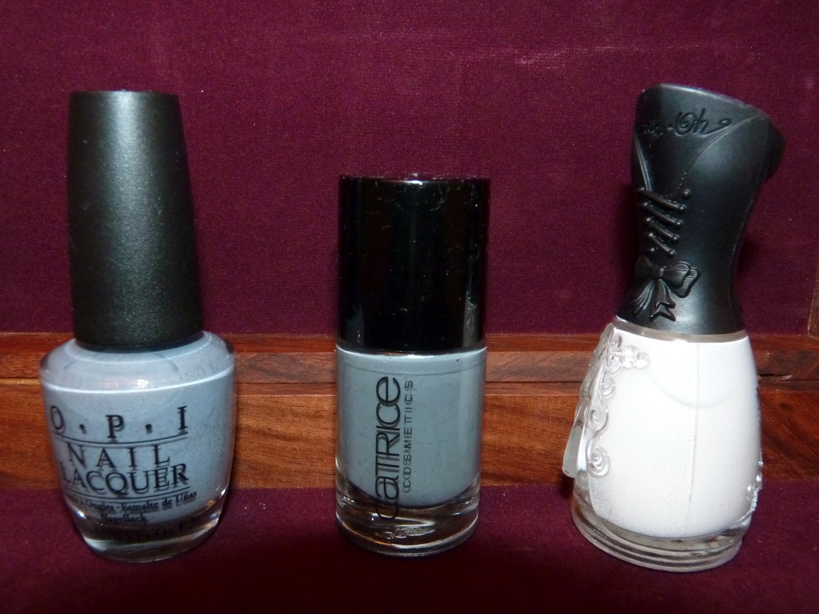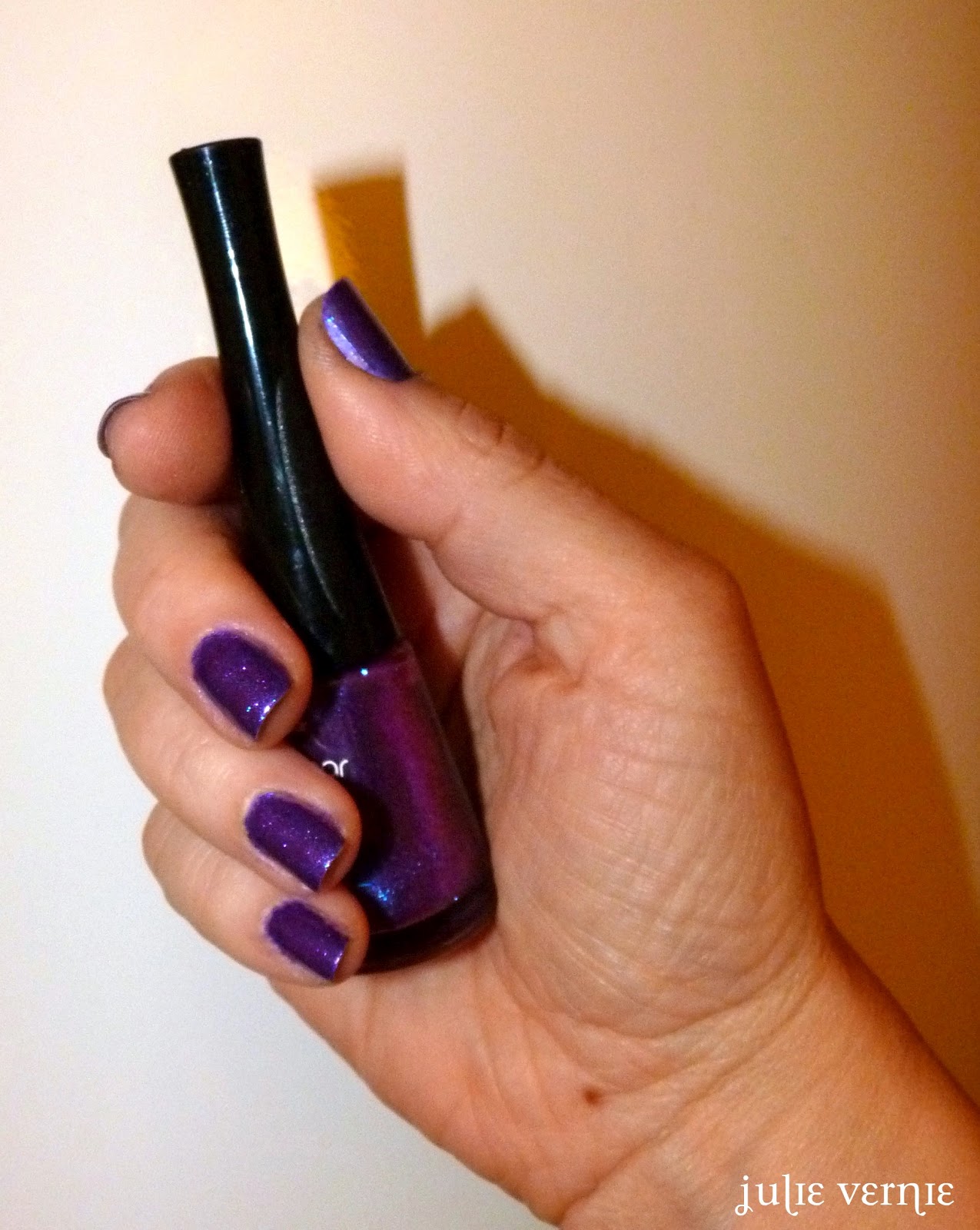 Je vous montre maintenant des tests divers et variés que j'avais faits avec les Catherine Arley 667 (gris holo) et 807 (doré holo) sur Gosh Lavender Blue (index et auriculaire) et sur un violet Kiko. J'aime particulièrement l'index. 2 couches de holo. Sur l'annulaire et l'auriculaire, je n'avais pas tellement aimé le doré tout seul, donc la deuxième couche de holo est en gris. Je vous demande toute votre indulgence pour cette photo car il s'agit d'essais, mais j'ai trouvé sympa de vous montrer quand même ces tentatives.