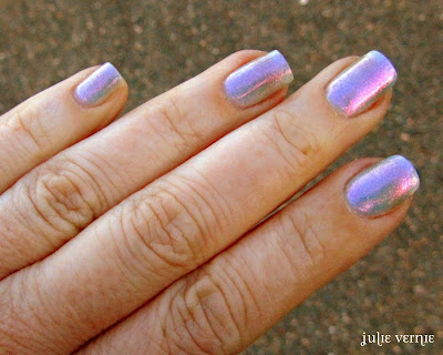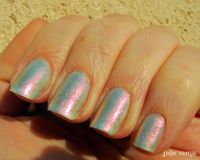 Petit détail mais de taille : pas besoin d'aquabase, ça glisse tout seul... Bien sûr, l'effet holo n'est pas aussi fort que dans un vernis tout fait, mais il est quand même visible et on peut s'amuser à customiser ce qu'on veut ! Tous les holos ne marchent pas, et notamment ceux qui ont besoin d'aquabase : ils sont bien sûr trop opaques.