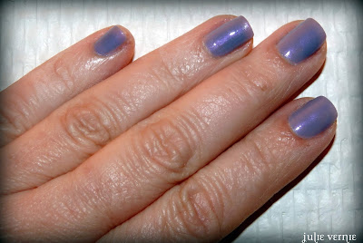 Dans le flacon et à la lumière naturelle, il est gris irisé rose tandis que sur la photo ci-dessus, le bleu ressort. Un gris tourterelle, disons. Pas bleu mais gris-mauve, comme sous le stamping.