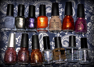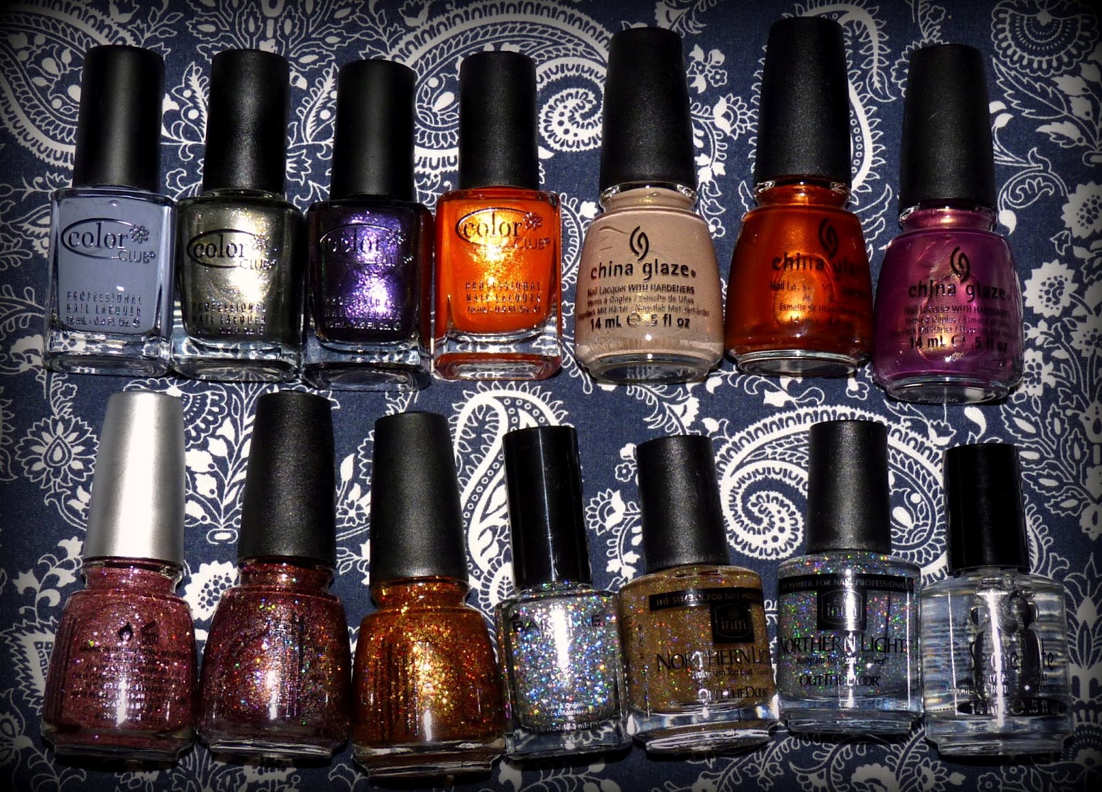 De gauche à droite, en haut : Color Club Shabby Drab, Snakeskin, Alias et Sparkle and Soar ; China Glaze Fast Track, Cross Iron et Awakening
