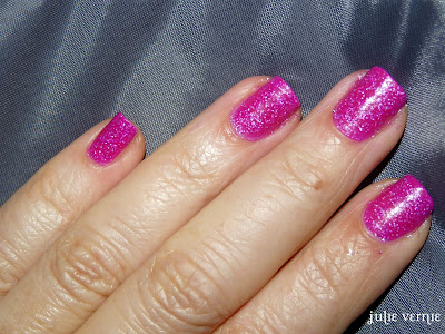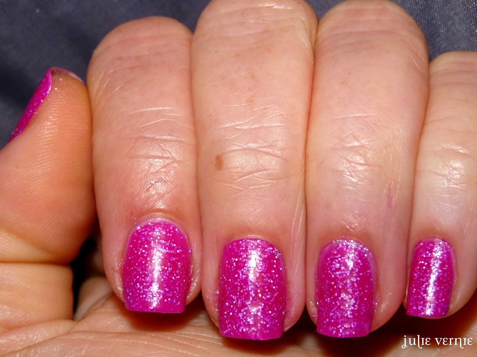 Je ne l'avais pas encore essayé ; or, avec ce temps morose et les vacances qui sont encore loin, j'avais besoin d'un vernis remonte-moral. Un fuschia holo à paillettes, cela m'a paru approprié. Mais à l'application, j'ai déchanté : la texture est une horreur, au point que je me suis demandé si je n'aurais pas dû mettre de l'aquabase. Le séchage est rapide... presque trop rapide, et le vernis prend rapidement une vilaine texture grumeleuse. Les paillettes lui donnent un fini rugueux et il est aussi pénible à ôter qu'à poser.