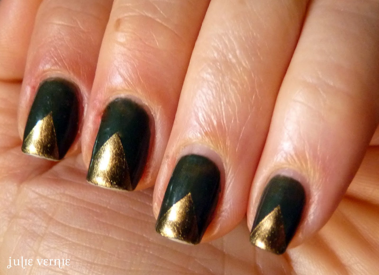 Pourquoi ai-je dit "mais", alors que j'aime bien le résultat ? C'est que la combinaison du vert foncé, du bronze et des angles évoque quelque chose de militaire. Inconsciemment, ai-je voulu protester contre l'image traditionnelle de la femme que ce phallocrate voulait m'imposer ? C'est bien possible. Mais je n'ai perçu cela que le lendemain matin, alors que ma manucure allait me tenir compagnie pendant toute une journée.