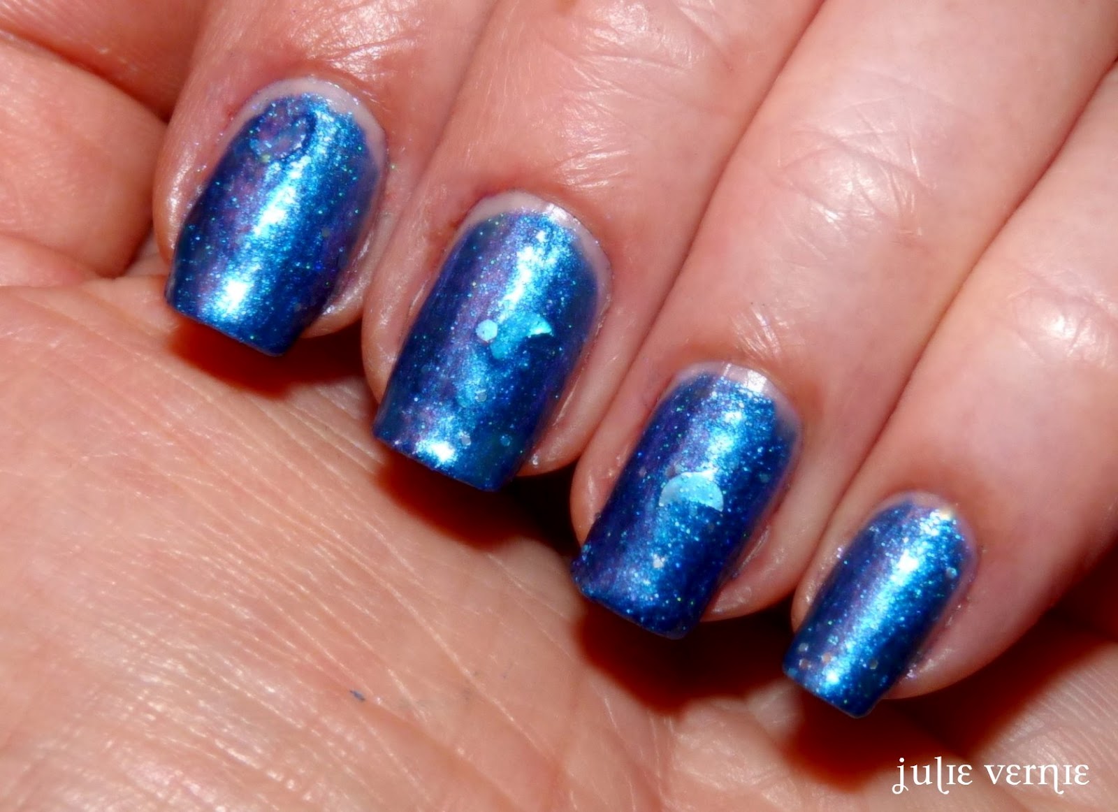 Bleu. Duochrome. Jelly. Avec des paillettes holo, des paillettes un peu plus grosses et des demi-lunes. Une prochaine fois, peut-être le superposerai-je à un autre vernis, mais pour l'instant, c'est l'heure bleue... Chut... Aimez-vous la nuit ?