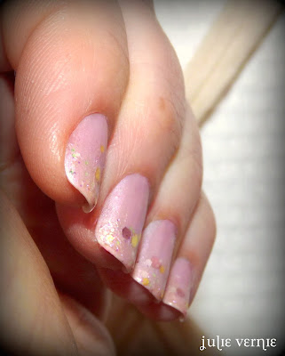 Comme cela me lasse un peu de porter ce vernis tout seul, j'ai ajouté quelques paillettes de A little kindness de Rainbow Honey. Vous comprenez maintenant l'origine du titre qui ne faisait pas uniquement référence à la douceur de ce rose. Et puis, de toute façon, la gentillesse, on en a toujours besoin...