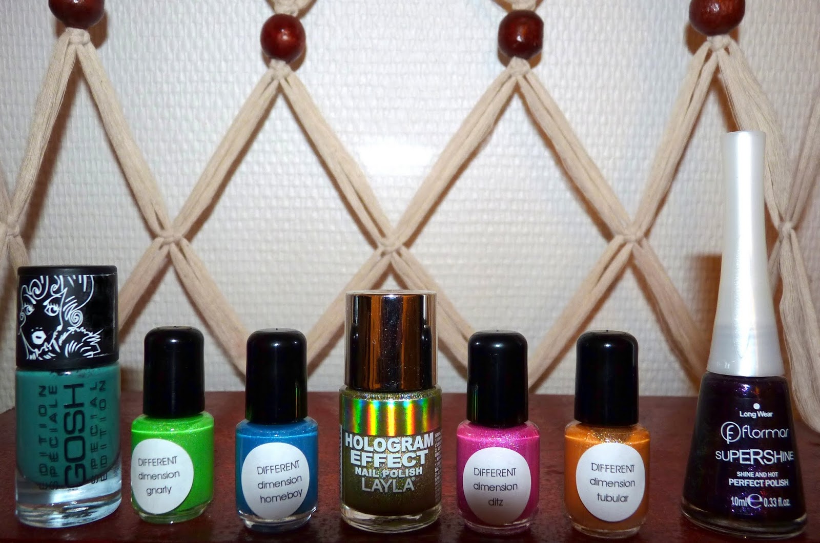 - Quatre minis holographiques aux couleurs vives, de la marque indépendante Different Dimension, collection 80's baby : je vous en ai présenté un ici. Et vous pouvez voir de magnifiques swatches de la collection complète chez Chalkboard Nails.