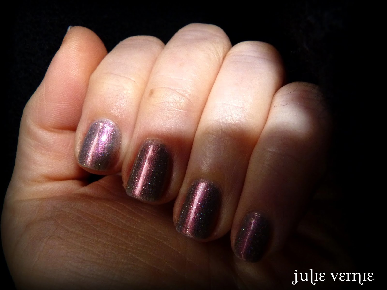Non, je ne vous oublie pas, je suis juste à la bourre pour publier... Pour vous consoler, un swatch du merveilleux vernis du moment : Dandy Nails Bathed in Light. N'est-ce pas qu'il porte bien son nom ? Même dans la pénombre, ce duochrome holographique rose et gris tourterelle brille de tous ses feux.