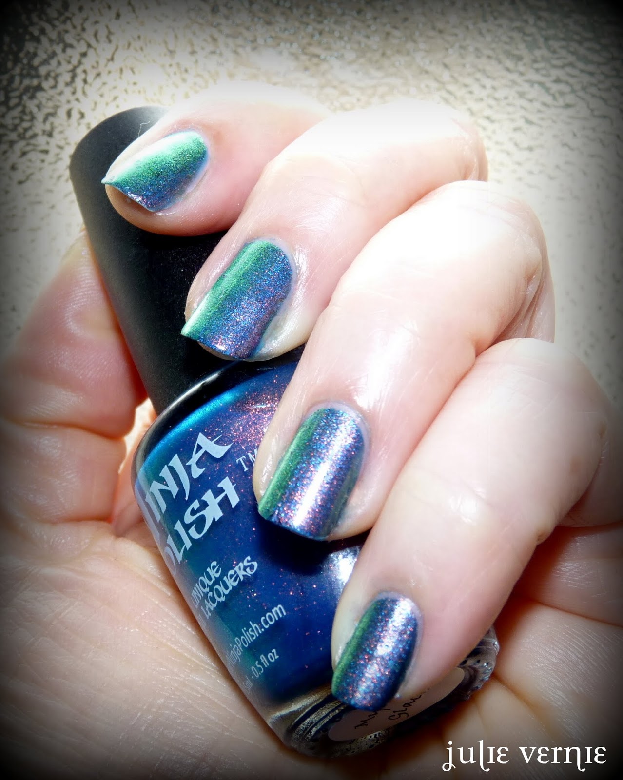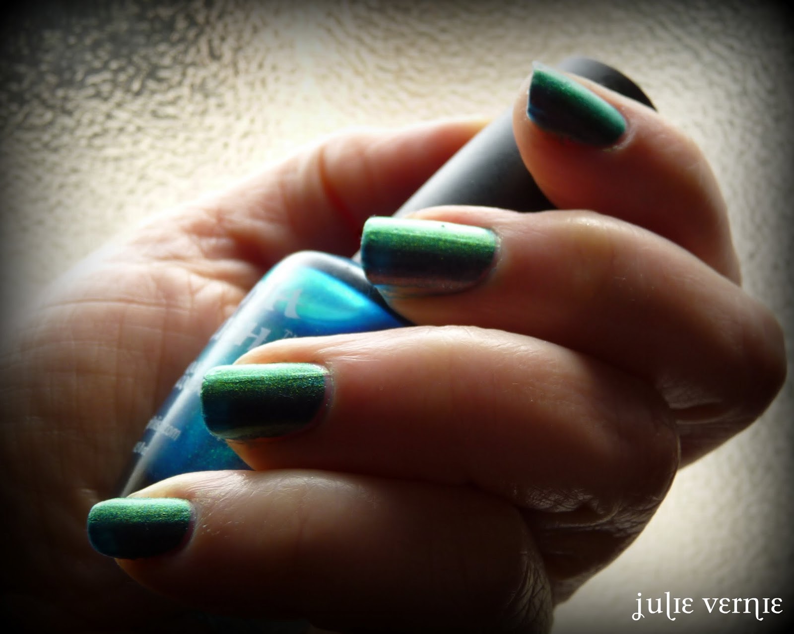 Contrary Polish Ain't No Sunshine. Un vernis qui fait clairement allusion à Illamasqua Raindrops que je n'ai pas pu acheter en solde, mais plus foncé et plus bleuté. Aves des flakies argentés qui feraient aimer le mauvais temps à tout un chacun. Je l'adore. Je vais devoir domestiquer l'application en faisant des couches plus fines, et je vais attendre aussi de meilleures occasions, car j'ai envie de teintes plus ensoleillées en ce moment.