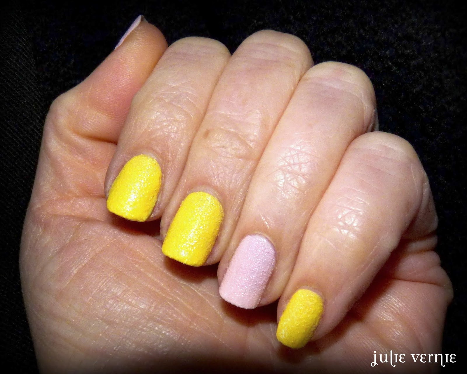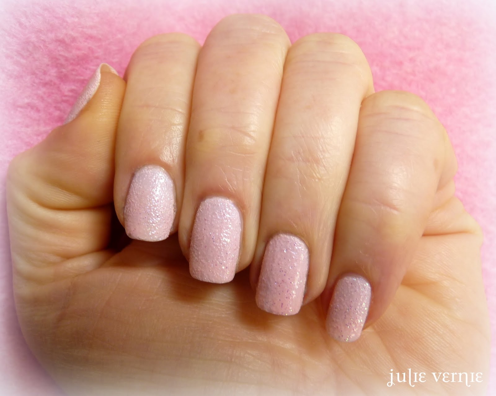 Pour fêter l'arrivée de mon colis, j'ai testé une couche d'un vernis de recouvrement à flakies bleus qui faisait partie du même envoi : Wing Dust Blue Steel. Il était initialement prévu pour aller sur du foncé plutôt que sur ce gris, mais j'aime bien le résultat final : le gris-bleu est homogène, le gel bleu est assez transparent pour ne pas laisser de traces, les flakies sont discrets mais présents (j'ai fait exprès de tester deux couches sur l'annulaire).