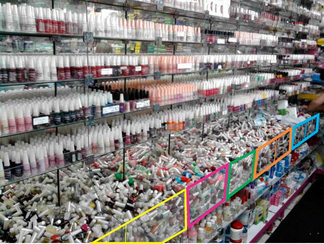 C'était à prévoir : j'ai eu dix mille choses à faire et je n'avais pas programmé assez d'articles, ni fait assez de swatches d'avance, pour tenir le rythme. Avec le peu que j'avais préparé, j'ai en tout cas essayé de vous montrer de belles paillettes et de beaux duochromes en attendant de vous raconter mes emplettes, car à São Paulo, il y a plusieurs parfumeries avec des rayons comme ceux-ci :