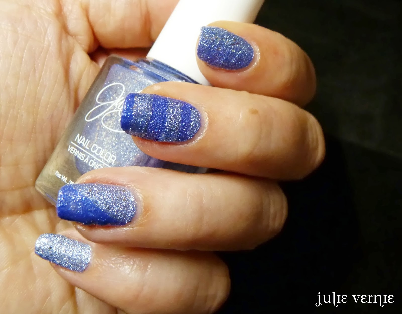 Le bleu est le Blueberry Fizz. Ici, on retrouve des paillettes métalliques de plus grande taille, comme dans le vert. La teinte est aussi douce que le toucher est rugueux.